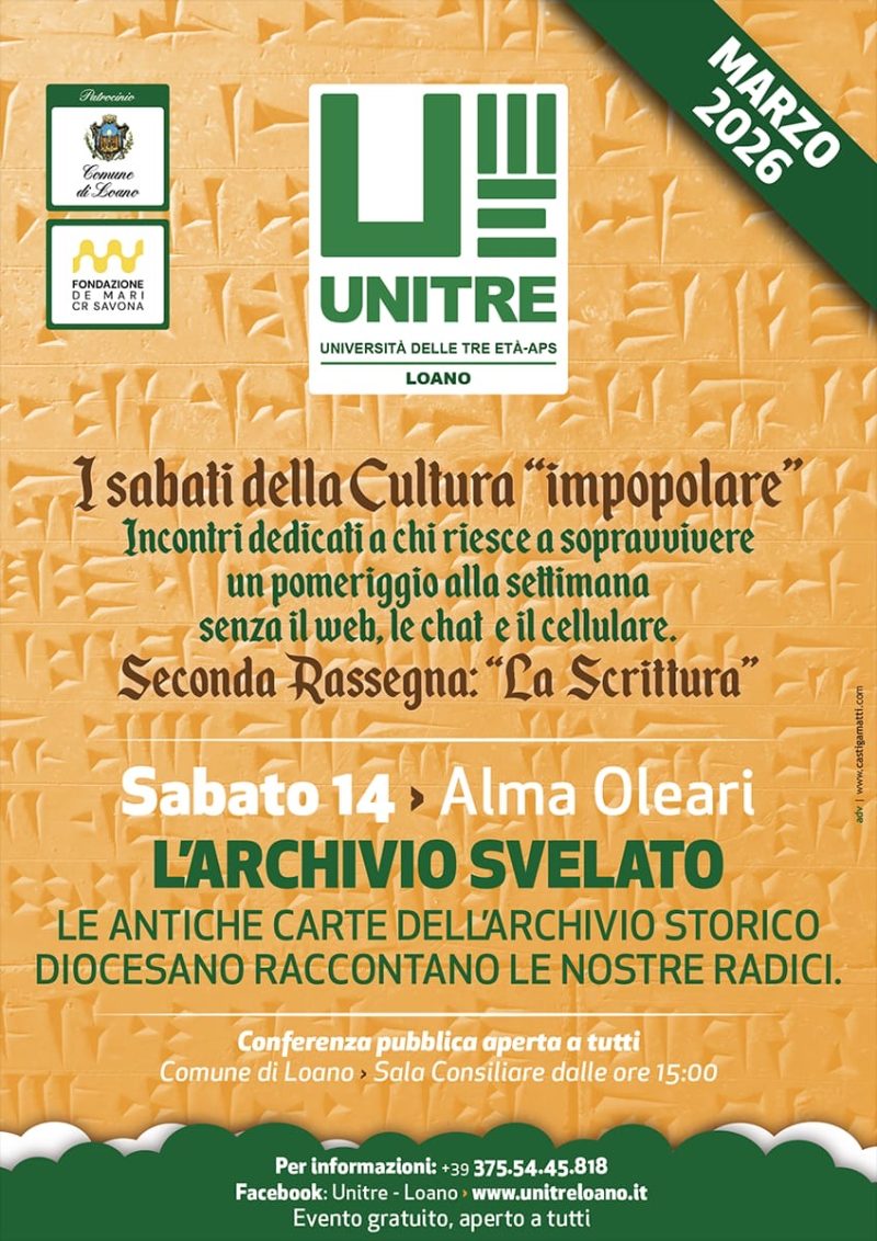 Domenica 16 novembre, ore 16.00, nel Santuario dei Santi Cosma e Damiano di Magliolo (SV) si terrà l’evento Memorie d’Inchiostro. Il nostro viaggio continua in questo mondo affascinante. Nel passato partendo dai documenti d’archivio che ci aiuteranno a comprendere meglio la storia di questo affascinante luogo. I documenti d’archivio sono una fonte preziosa di informazioni che ci consentono di ricostruire gli eventi passati con precisione e … Continua a leggere Memorie d’inchiostro: domenica 16 novembre – nel Santuario dei Santi Cosma e Damiano di Magliolo (SV) »