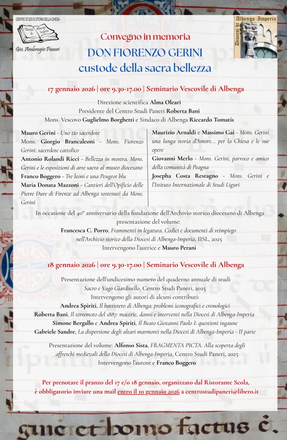Il Centro Studi di Storia della Chiesa nella Diocesi di Albenga-Imperia “Gio. Ambrogio Paneri” organizza il convegno “Don Fiorenzo Gerini custode della sacra bellezza”, che si terrà il 17 e 18 gennaio 2026 presso il Seminario vescovile di Albenga (SV). Nel corso dell’evento, nella sessione pomeridiana di sabato 17 gennaio, sarà presentata la pubblicazione di Francesca Christina Porro, Frammenti in legatura. Codici e documenti di … Continua a leggere Frammenti in legatura – Presentazione del libro di Francesca C. Porro